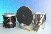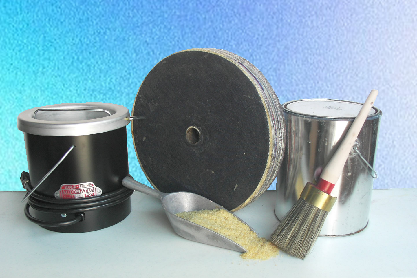 2-quart and 4-quart glue pots, hot (ground) glue, cold liquid S-glue, Gripmaster-glue. All used for setting up polishing wheels.